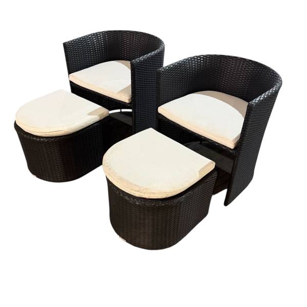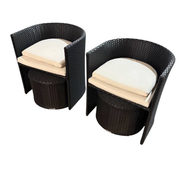 This set consist of 2 lounge chairs with ottoman (inclusive of seat cushions).