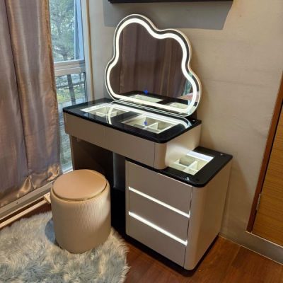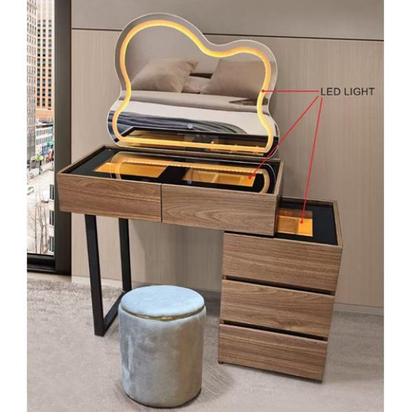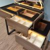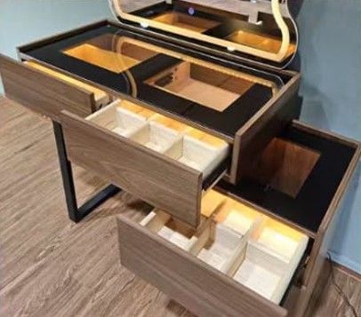 - LED lights on mirror and interior drawers.
